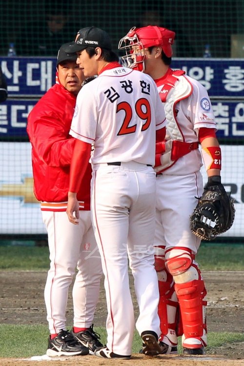 한국시리즈 4차전 삼성 라이온즈와 SK 와이번스의 경기가 29일 인천 문학구장에서 열렸다. 4회초 삼성 공격, SK 선발 투수 김광현이 2실점을 내준 후 강판되고 있다.