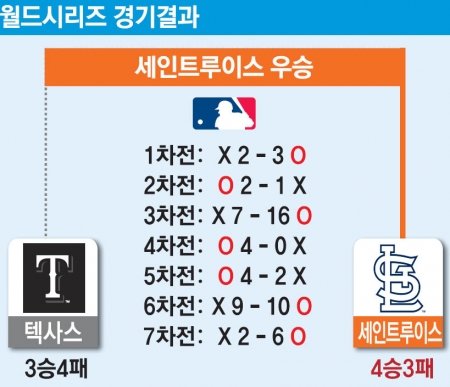 내셔널리그 챔피언 세인트루이스는 29일(한국시간) 부시스타디움에서 열린 아메리칸리그 챔피언 텍사스와의 WS 7차전에서 6-2로 승리, 시리즈 전적 4승3패로 통산 11번째이자 2006년 이후 5년 만에 메이저리그 정상에 올랐다. 뉴욕 양키스(통산 27회) 다음으로 많은 우승 횟수. 또 와일드카드로 WS 우승을 차지한 역대 5번째 팀이 됐다.