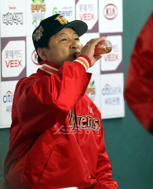 31일 저녁 서울 잠실야구장에서 열린 SK와 삼성의 프로야구 한국시리즈 5차전에서 SK 이만수 감독 대행이 8회초 공격때 음료수를 마시며 목을 축이고 있다.