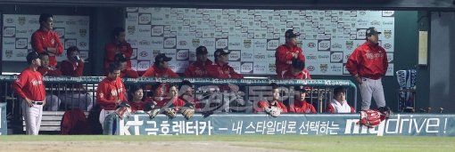31일 서울 잠실야구장에서 열린 2011 프로야구 한국시리즈 5차전 삼성과 SK의 경기에서 8회초 1대 0으로 뒤진 SK 덕아웃에 패색이 짙어지고 있다.