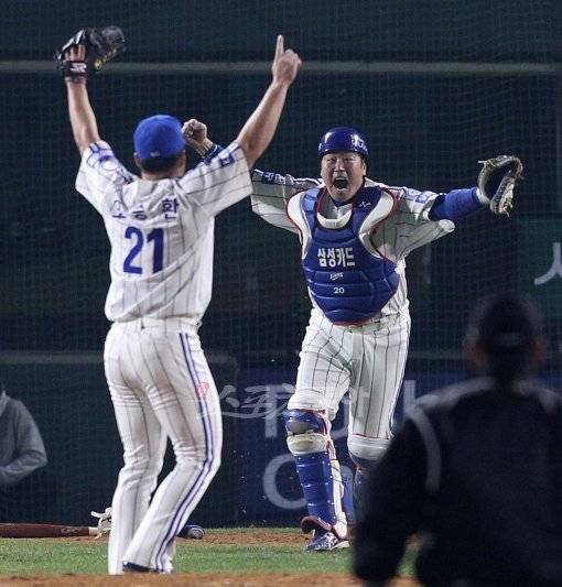 삼성라이온즈 마무리 오승환과 포수 진갑용이 31일 서울 잠실야구장에서 열린 2011 프로야구 한국시리즈 5차전 SK의 경기에서 1대 0으로 이겨 우승을 확정짓자 기뻐하고 있다.