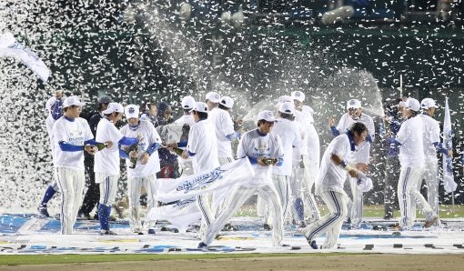 31일 서울 잠실야구장에서 열린 2011 프로야구 한국시리즈 5차전에서 승리한 삼성이 우승의 기쁨을 나누고 있다.