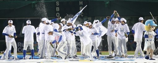 31일 서울 잠실야구장에서 열린 2011 프로야구 한국시리즈 5차전에서 승리한 삼성이 우승의 기쁨을 나누고 있다.