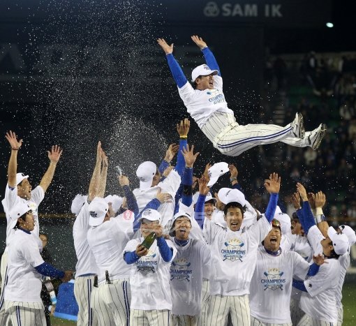프로야구 한국시리즈 5차전 삼성 라이온즈와 SK 와이번스의 경기가 30일 서울 잠실구장에서 열렸다. 1대 0으로 한국시리즈 우승을 한 삼성 선수들이 류중일 감독을 헹가래치고 있다.