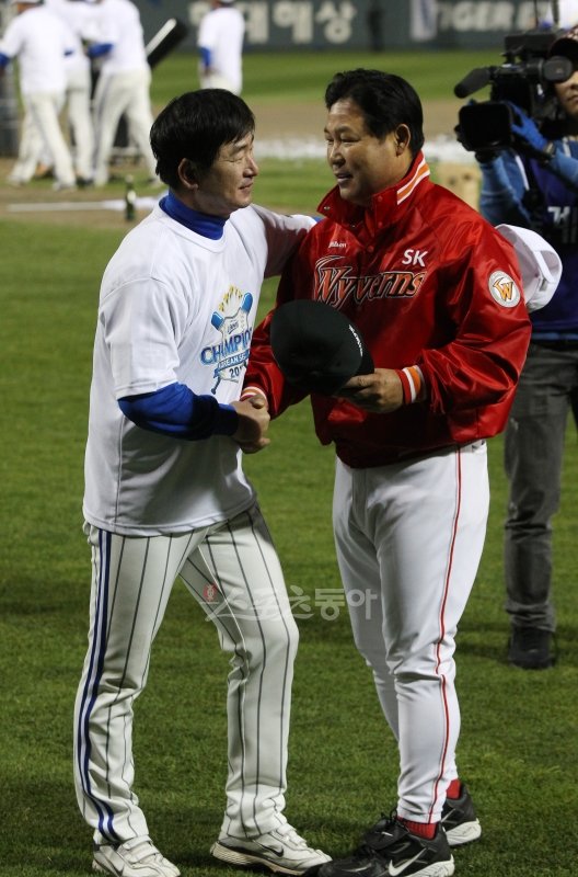 1대 0으로 한국시리즈 우승을 한 삼성 류중일 감독이 SK 이만수 감독대행과 인사를 하고 있다.