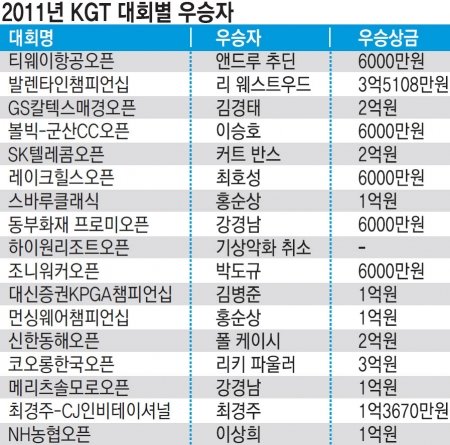 2011 한국남자프로골프투어(KGT)가 10월30일 NH농협 오픈을 끝으로 마무리됐다. KGT투어는 4월 티웨이항공오픈을 시작으로 모두 17개 대회를 치렀다. 올해는 다관왕이 없는 게 특징. 2011년 시즌을 되돌아본다.