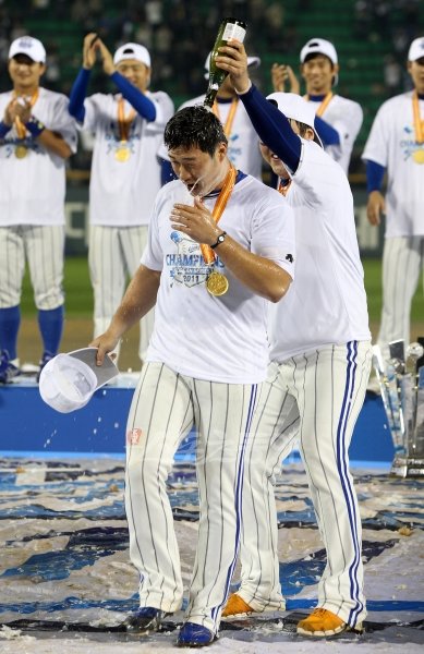 한국시리즈 최우수선수(MVP)에 선정된 삼성 오승환이 시상대에 오르기 직전 안지만이 샴페인 세례를 하며 축하하고 있다. 잠실|국경원 기자 onecut@donga.com 트위터 @k1isoncut