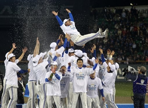 한국시리즈 우승을 한 삼성 선수들이 류중일 감독을 헹가래치고 있다. 잠실|국경원 기자 onecut@donga.com 트위터 @k1isonecut