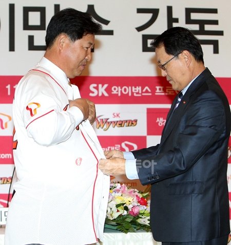 SK 신임 이만수 감독이 3일 오전 서울 중구 SKT타워에서 열린 취임식에서 SK텔레콤 정만원 사장으로부터 유니폼을 받아 입고 있다. 계약서를 들며 포즈를 취하고 있다. SK 제4대 사령탑으로 선임된 이만수 감독은 1일 SK 구단과 계약기간 3년에 계약금 2억5000만원·연봉 2억5000만원 등 총 10억원에 계약을 맺었다.