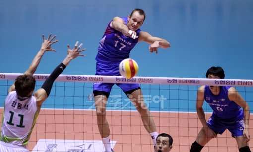 대한한공 마틴이 서울드림식스 최홍석의 블로킹을 피해 공격하고 있다.