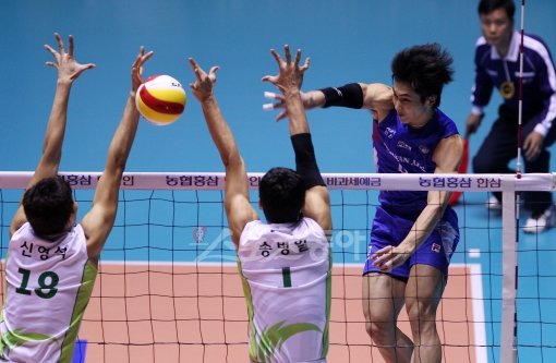 3일 오후 서울 중구 장충실내체육관에서 프로배구 2011 ~ 2012 V-리그 서울드림식스와 대한항공의 경기가 열렸다. 대한한공 김학민이 서울드림식스 신영석과 송병일의 블로킹을 뚫고 공격하고 있다.