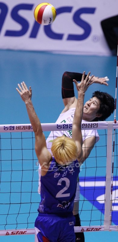 서울드림식스 안준찬이 대한항공 한선수의 블로킹을 앞에 두고 공격하고 있다.