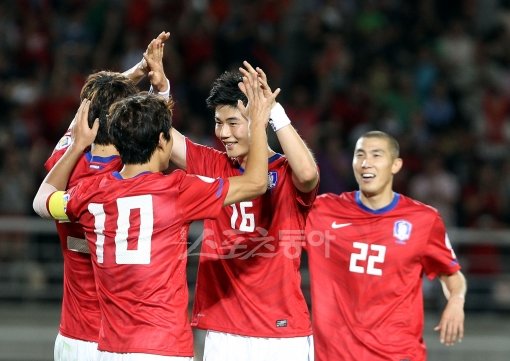 2014브라질월드컵 아시아 최종예선 진출을 다짐한 조광래호의 운명은 이달 열리는 중동 원정 2연전에 달려있다. 9월 홈에서 열린 레바논과 아시아 3차 예선 1차전에서 승리한 태극전사들이 기뻐하는 모습. 스포츠동아DB