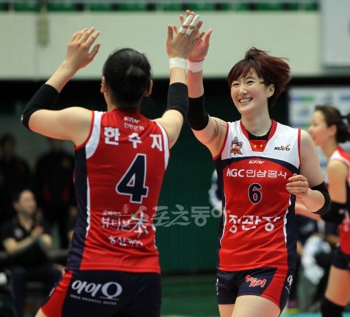 KGC인삼공사 장소연(오른쪽)이 8일 도로공사와의 경기에서 블로킹 득점에 성공한 뒤 한수지와 하이파이브 하고 있다. 성남|김종원 기자 won@donga.com 트위터@beanjjun