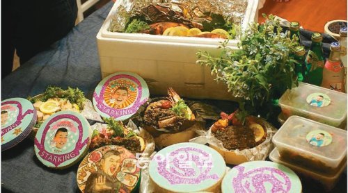강호동에게 전달된 ‘100만 원짜리’ 도시락의 일부. 맨 뒤 흰 스티로폼 상자에 들어 있는 게 바닷가재이고 그 앞 뚜껑 열린 통에 전복회, 떡갈비와 대하, 연잎밥 등이 보인다. 도시락의 뚜껑은 강호동의 사진과 도시락 제작자가 직접 그린 그림으로 꾸몄다. 프로그램 ‘스타킹’의 로고를 큐빅과 각종 레이스로 장식한 뚜껑도 있다. 수지킴 도시락 아트 제공