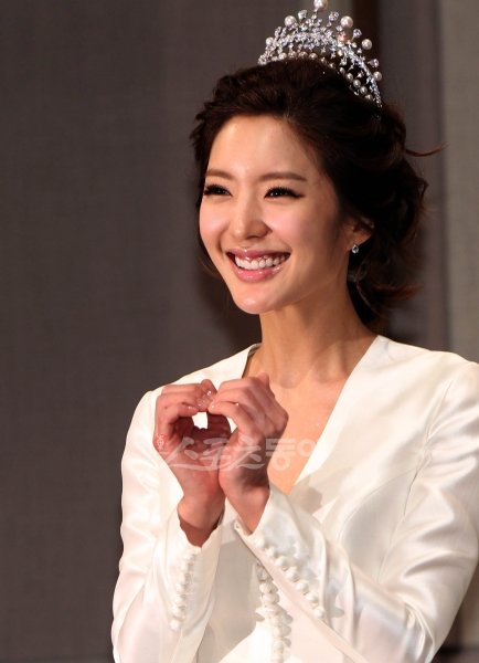 서지영이 10일 서울 중구 장충동 신라호텔에서 5세 연상 남자친구와 웨딩마치를 울리기 전 공식 기자회견에서 손하트를 날리며 행복한 웃음을 짓고 있다. 임진환 기자 photolim@donga.com 트위터@binyfafa