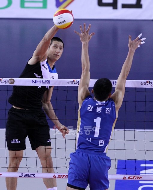 현대캐피탈 문성민이 상무신협 강동진의 블로킹을 피해 공격하고 있다.