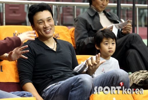 농구장을 찾은 ‘국민타자’. 한국 복귀를 선언하고 일본에서 돌아온 이승엽이 아들 은혁 군과 함께 13일 잠실실내체육관에서 열린 프로농구 삼성-SK의 경기를 관람하며 미소 짓고 있다. 사진제공|스포츠코리아