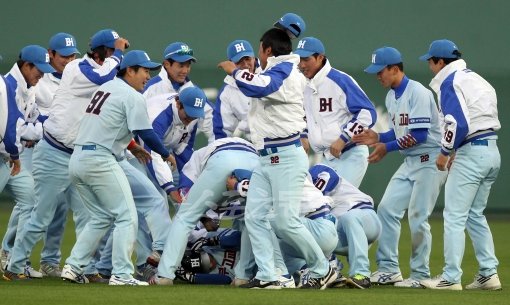13일 사직구장에서 열린 경남고와 부산고 졸업생간의 경기 ‘부산야구 라이벌 빅매치’에서 박계원 롯데 코치가 9회말 무사 만루서 끝내기안타를 치자 부산고 졸업생들이 모두 뛰어나와 환호하고 있다부산고 출신 클리블랜드 추신수가 경기장을 찾아 강상수 LG 스카우트와 악수하고 있다. 경남고 사령탑을 맡은 김용희 SK 2군 감독이 모처럼인 동문과의 경기가 즐거운 듯 환하게 웃고 있다. 부산고 마해영 해설위원은 안타를 날리며 녹슬지 않은 타격을 선보였다.