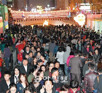 4일 시작해 20일까지 서울 청계천에서 열리고 있는 ‘2011 서울 등 축제’에 엄청난 인파가 몰리고 있다. 13일까지 축제를 찾은 인원은 177만여 명으로 하루 평균 18만여 명에 이른다. 주말에는 더 많아 12일 하루 30만6300여 명의 발길이 이어졌다. 축제 기간은 아직 일주일 정도 남아 지난해 총 관람객 수 220만 명을 넘어 300만 명에 이를 것으로 전망된다. 외형이 커지는 만큼 안전사고와 무질서도 함께 늘어나는 것 아니냐는 우려도 나오고 있다.