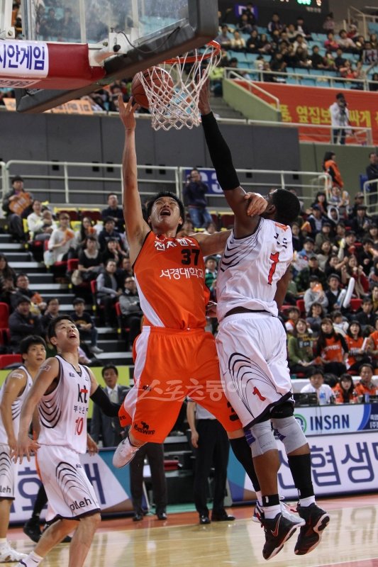 16일 인천 삼산체육관에서 열린 2011-2012 프로농구 인천 전자랜드와 부산 KT의 경기에서 전자랜드 주태수의 슛을 KT 로드가 블록슛하고 있다.