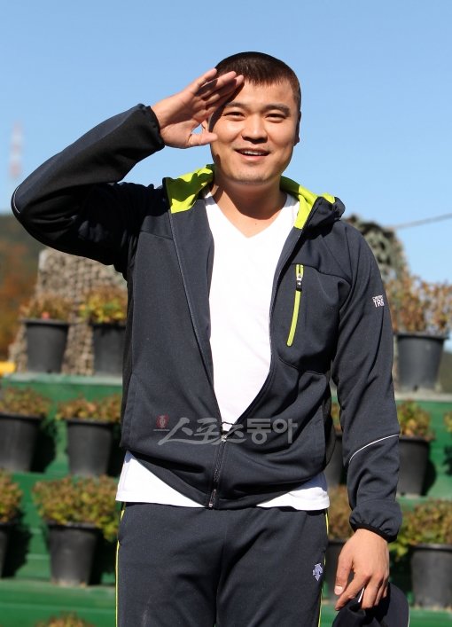 클리블랜드 추신수가 21일 오후 부산 해운대 53사단 신병교육대에 4주간의 기초군사훈련을 받기위해 입소했다. 추신수가 입영소에서 취재진을 향해 거수경례를 하고 있다. 추신수는 지난 광저우 아시안게임에서 금메달을 목에 걸며 병역혜택을 받았다.