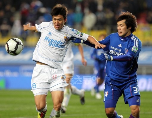 23일 수원월드컵경기장에서 열린 2011 K리그 챔피언십 준플레이오프 수원삼성 대 울산현대 경기에서 울산현대 이호와 수원삼성 양상민이 볼다툼을 하고 있다. 수원|김종원기자 won@donga.com 트위터 @beanjjun