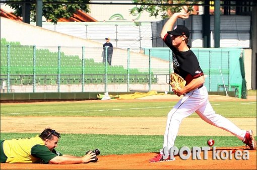 24일 오전 대만 타이중 인터컨티넨탈 야구장에서 열린 호주 퍼스 히트의 공식연습훈련에 참석한 호주기자가 촬영하고 있다.