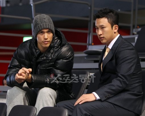 24일 저녁 경기도 고양시 고양실내체육관에서 열린 고양 오리온스와 인천 전자랜드의 프로농구경기에서 오리온스 이동준이 김승현과 경기를 관전하고 있다.