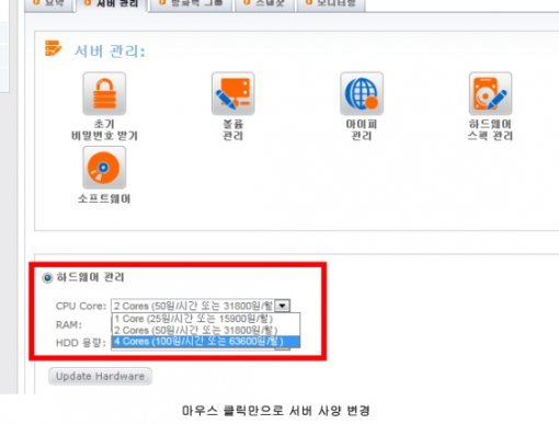 앞서 언급한 대로 ‘하드웨어 스펙 관리’에서는 현재 서버의 CPU, 메모리, 하드디스크 사양을 자유롭게 변경할 수 있다는 점도 클라우드 컴퓨팅 만의 매력이다. 처음 서버 생성 때보다 처리 성능을 높여야 한다면 언제든지 마우스 클릭 몇 번 만으로 사양을 변경할 수 있다. 단 서버는 재부팅해야 한다.