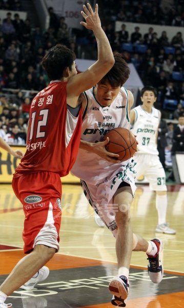 원주 동부 김주성(오른쪽)이 25일 잠실학생체육관에서 열린 서울 SK와의 경기에서 한정원의 수비를 뚫고 골밑으로 파고들고 있다. 잠실|박화용 기자 inphoto@donga,com 트위터 @seven7sola