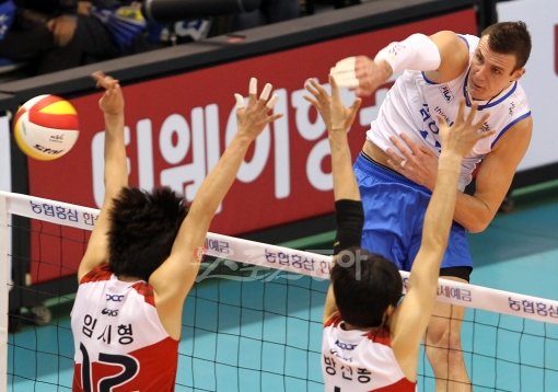 삼성화재 가빈 슈미트(오른쪽)가 27일 열린 KEPCO와 경기에서 임시형과 방신봉의 블로킹 벽 사이로 강력한 스파이크를 내리 꽂고 있다. 대전|김종원 기자 won@donga.com 트위터 @beanjjun