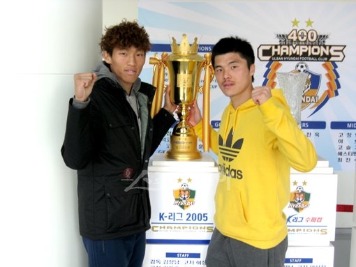 울산의 수호신 김승규(왼쪽)와 김영광이 27일 클럽하우스에 전시된 2005년 우승트로피 앞에서 파이팅을 외치며 2011 K리그 우승을 다짐하고 있다. 울산|윤태석 기자 sportic@donga.com 트위터@Bergkamp08