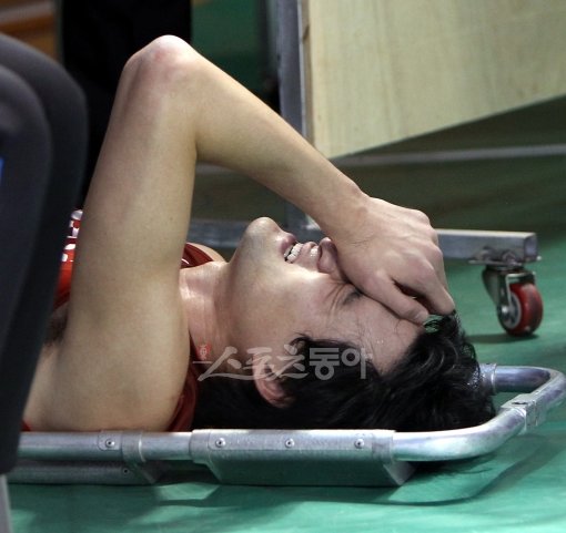 LIG손해보험 이경수가 ‘흉곽출구증후군’ 증상으로 수술을 받았다. 10일 대전충무체육관에서 열린 삼성화재전에서 부상을 입은 이경수가 고통스러워하고 있다.스포츠동아DB