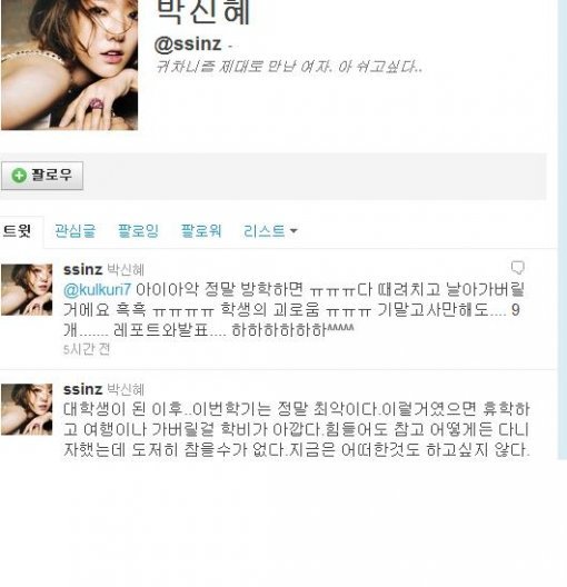 박신혜는 28일 트위터(@ssinz)에 대학생활을 하는 마음을 글로 썼다. 박신혜는 “대학생이 된 후 이번 학기는 정말 최악이다”며 “휴학하고 여행이나 가버릴걸. 학비가 아깝다. 힘들어도 참고 어떻게든 다니자 했는데. 도저히 참을 수가 없다”고 밝혔다.
