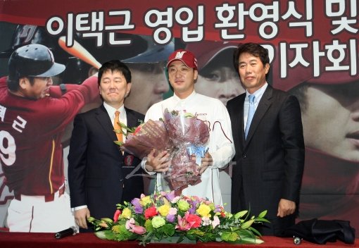 친정팀 넥센 히어로즈로 복귀하는 이택근(31)이 29일 오전 서울 목동 야구장에서 복귀 환영식과 기자회견을 가졌다. 이날 환영식에서 이장석 대표이사가 이택근에게 기존에 사용하던 29번이 새겨진 넥센 유니폼을 전달하며 김시진 감독과 함께 기념촬영하고 있다. 이택근은 2003년 현대 유니콘스 소속으로 프로 무대에 데뷔했고 2009년 말 박영복, 강병우 + 25억원에 LG 트윈스로 트레이드 됐다.