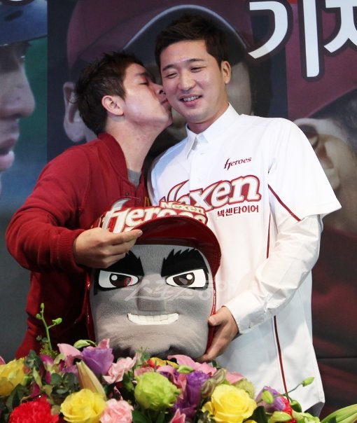 친정팀 넥센 히어로즈로 복귀하는 이택근(31)이 29일 오전 서울 목동 야구장에서 복귀 환영식과 기자회견을 가졌다. 기자회견을 마친 이택근이 넥센 마스코트 턱돌이의 장난에 당황해 하고 있다. 이택근은 2003년 현대 유니콘스 소속으로 프로 무대에 데뷔했고 2009년 말 박영복, 강병우 + 25억원에 LG 트윈스로 트레이드 됐다.