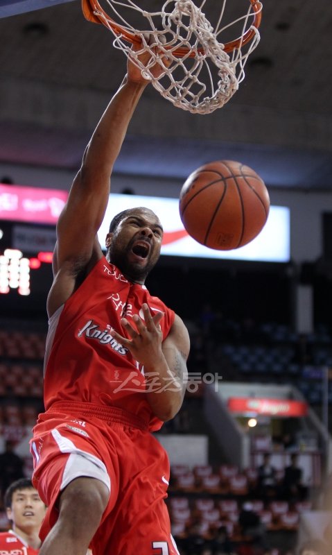 29일 오후 서울 잠실학생체육관에서 열린 2011 ~ 2012 프로농구 SK와 전자랜드의 경기에서 SK 존슨이 덩크슛을 성공시키며 포효하고 있다.