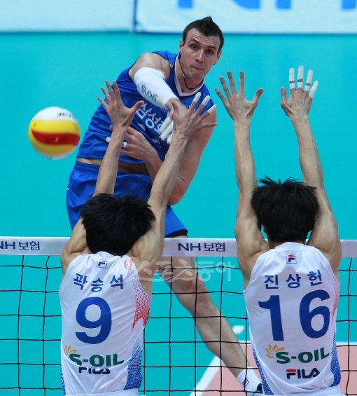 4일 인천 도원실내체육관에서 열린 2011-2012 프로배구 남자부 대한항공과 삼성화재의 경기에서 삼성화재 가빈이 대한항공 곽승석과 진상헌을 상대로 스파이크를 때리고 있다.