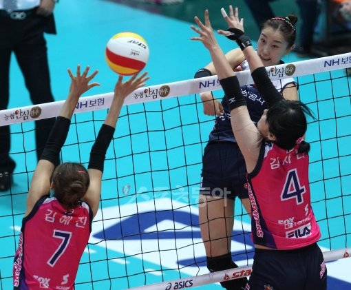 4일 인천 도원실내체육관에서 열린 2011-2012 프로배구 여자부 흥국생명과 인삼공사의 경기에서 인삼공사 한유미가 상대 수비벽에 맞서 공격하고 있다.