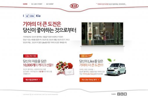 기아자동차가 글로벌 캠페인으로 진행하고 있는 ‘아이 라이크(I Like)’ 광고로, 페이스북의 상징이라 할 수 있는 라이크(Like·좋아요) 버튼을 활용했다. 다양한 연령대의 사람들이 기아의 자동차를 보거나 이용하면서 즐거워하는 모습을 보여 주며 “고객이 좋아하는 것으로부터 기아의 더 큰 도전이 시작된다”는 메시지를 전하고 있다.