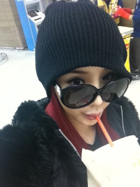 사진에서 박봄은 얼굴이 다 가려질 법한 커다란 선글라스에 블랙 비니, 퍼 소재의 상의 차림이다. 붉게 물들인 머리와는 배치되는 느낌.