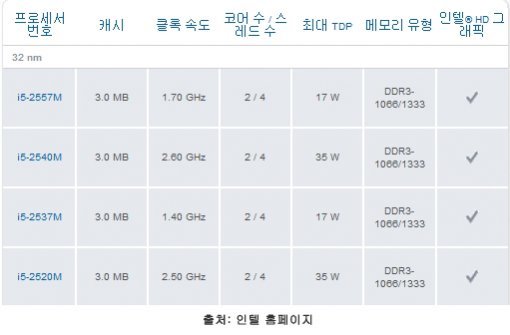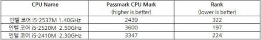 울트라북에 탑재되는 프로세서는 전력 소모량이 낮은 초저전력(ULV, Ultra Low Voltage) 프로세서이다. 아래 표를 보면(여기서는 인텔 프로세서에 대해서만 알아보도록 하겠다) 같은 i5 제품이더라도 i5-2537M(동작 속도: 1.4GHz)과 i5-2520M(동작 속도: 2.5GHz)의 동작 속도가 크게 차이가 나는 것을 확인할 수 있다. 즉, 일반 노트북에 탑재되는 표준 전력의 프로세서와 울트라북에 탑재되는 초저전력 프로세서는 태생적으로 성능 차이가 있을 수밖에 없다.