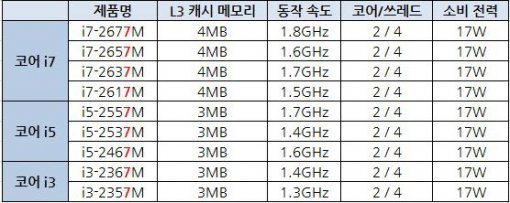 울트라북에 탑재되는 프로세서의 소비 전력은 가장 낮은 17W에 불과하다. 한가지 팁이라면, 인텔 2세대 코어 i 프로세서 제품명 중 4자리 숫자에서 맨 끝 숫자가 ‘7’인 제품이 초저전력 프로세서다. 현재 출시한 초저전력 프로세서의 종류는 다음과 같다.