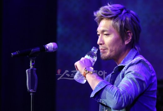 가수 임재범이 7일 오후 서울 서초구 리버사이드호텔 콘서트홀에서 열린 '임재범 리메이크 앨범 [풀이(free)]쇼케이스'에서 화려한 공연을 펼치던중 물을 마시고 있다.
