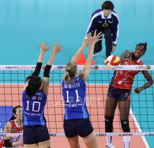 7일 경기도 화성종합스포츠타운 내 배구실내체육관에서 열린 2011-2012 프로배구 여자부 IBK기업은행과 인삼공사의 경기에서 인삼공사 몬타뇨가 기업은행 박정아와 알레시아의 수비에 맞서 스파이크를 때리고 있다.