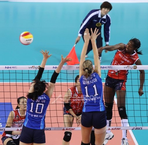 7일 경기도 화성종합스포츠타운 내 배구실내체육관에서 열린 2011-2012 프로배구 여자부 IBK기업은행과 인삼공사의 경기에서 인삼공사 몬타뇨가 기업은행 박정아와 알레시아의 수비에 맞서 스파이크를 때리고 있다.