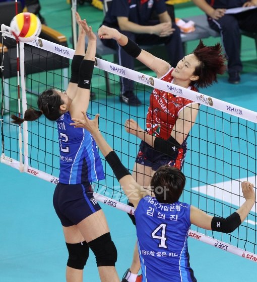 7일 경기도 화성종합스포츠타운 내 배구실내체육관에서 열린 2011-2012 프로배구 여자부 IBK기업은행과 인삼공사의 경기에서 인삼공사 장소연이 상대 수비벽을 두고 공격하고 있다.