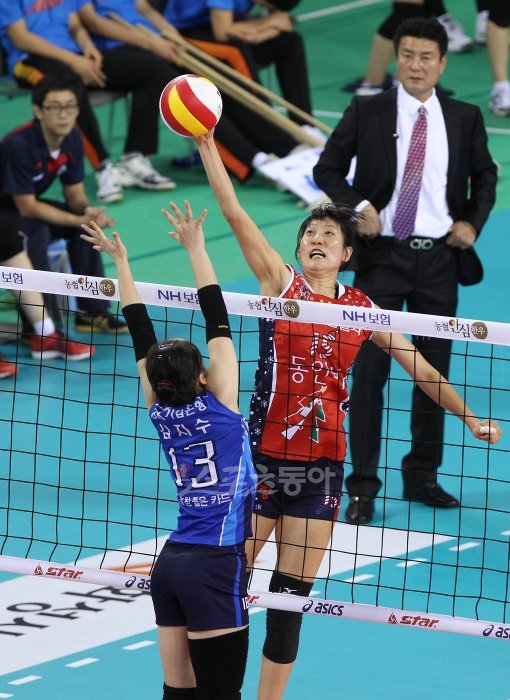 7일 경기도 화성종합스포츠타운 내 배구실내체육관에서 열린 2011-2012 프로배구 여자부 IBK기업은행과 인삼공사의 경기에서 인삼공사 김세영이 기업은행 김지수를 상대로 공격하고 있다.