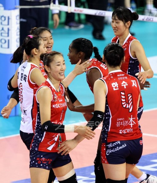 7일 경기도 화성종합스포츠타운 내 배구실내체육관에서 열린 2011-2012 프로배구 여자부 IBK기업은행과 인삼공사의 경기에서 공격에 성공한 인삼공사 선수들이 기뻐하고 있다.